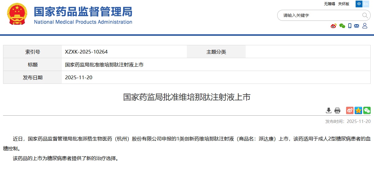 央视新闻:国家药监局近日批准上市一类突破性药物贝那肽注射液(商品名:派达康),该药由佩吉生物制药(杭州)有限公司推出,适用于控制成人2型糖尿病患者的血糖。该药物的上市为糖尿病患者提供了新的治疗选择。